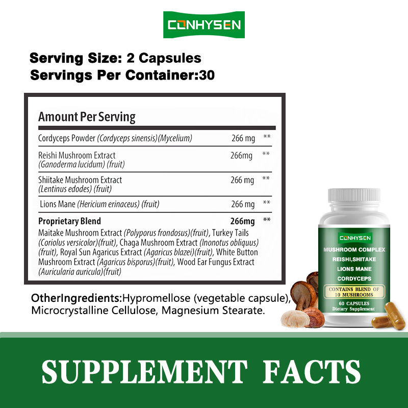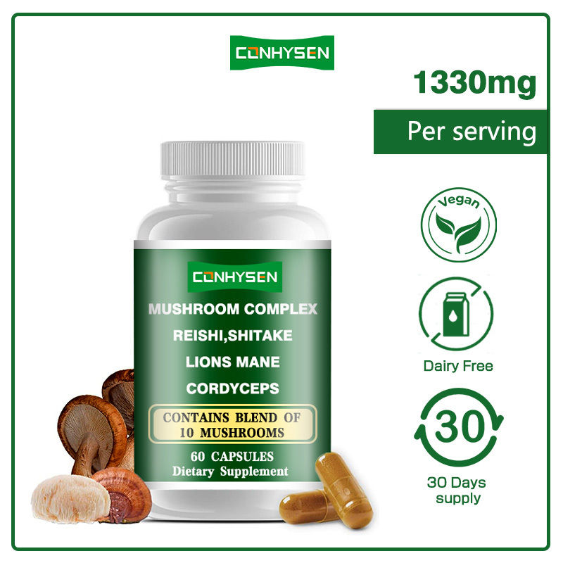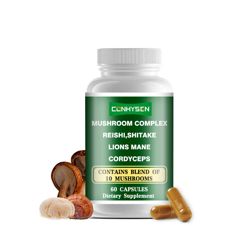 Mushroom Complex Capsules is een voedingssupplement dat wetenschappelijk is geformuleerd en verfijnd uit verschillende functionele paddestoelen zoals Reishi, Shiitake, Lingzhi mycelium en Tremella.Het bevat de kostbare actieve ingrediënten zoals polysacchariden, terpenoïden, ergothioneïne en mineralen uit deze paddenstoelen, die fungeren als een natuurlijke gezondheidsplatform die een multidimensionale gezondheidsbescherming voor het menselijk lichaam biedt.