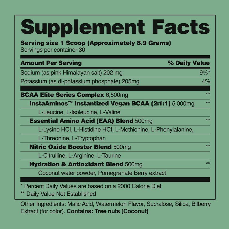 Ingrediënten:Natrium, Kalium, BCAA Elite Series Complex, Instantized Vegan BCAA, Essentiële Aminozuur Mengsel, Stikstofmonoxide Booster Mengsel, Hydratatie & Antioxidant Mengsel
