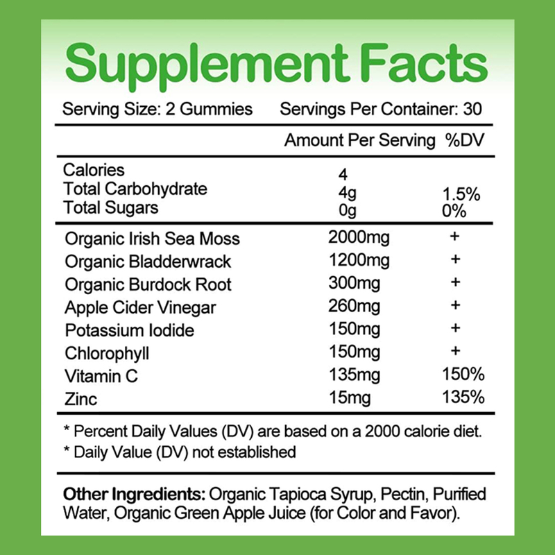 Biologische Ierse zee mos, vitamine C, zink, biologische blaaswrack, biologische bordeauxwortel, appelazijn, kaliumjodied, chlorofyl