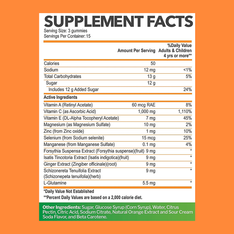 Vitamine C, Vitamine A, Vitamine E, Zink, Magnesium, Selenium, Mangaan, Gember Extract, Forsythia Suspensa Extract, Isatis Tincotoria Extract, Schizonereta Tenuifolia Extract, L-Glutamine