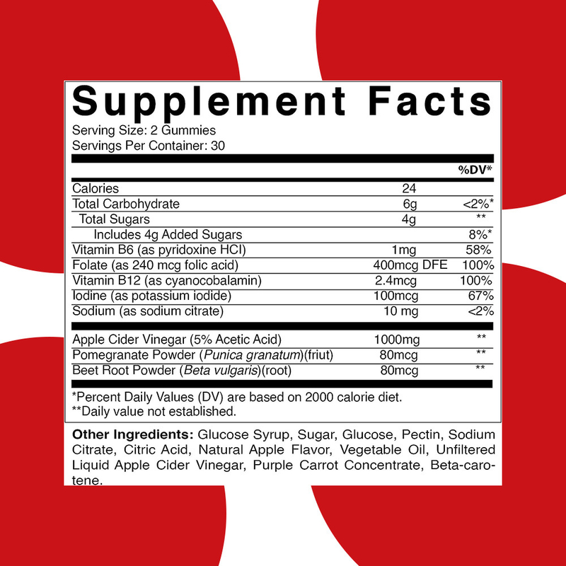 Appelseeg, vitamine B6, foliumzuur, vitamine B12, jodium, natrium, granaatappelpoeder, bietenwortelpoeder
