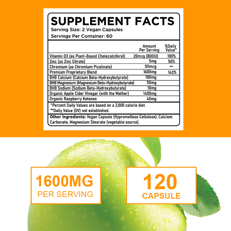 Biologische appelazijn, vitamine D3, zink, chroom, exclusief mengsel, BHB calcium, BHB magnesium, BHB natrium, biologische framboosketonen