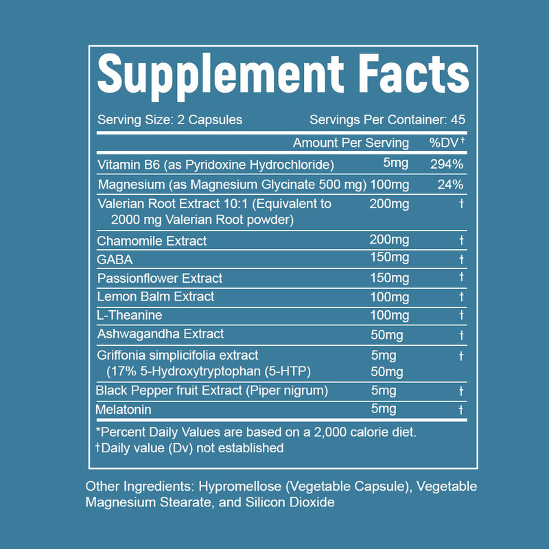 Vitamine B6, magnesium, valeriaanwortel-extract, kamille-extract, GABA, passiebloem-extract, citroenblaam-extract, L-theanine, ashwagandha-extract, Griffonia simplicifolia-extract,Extract van zwarte peper, Melatonine
