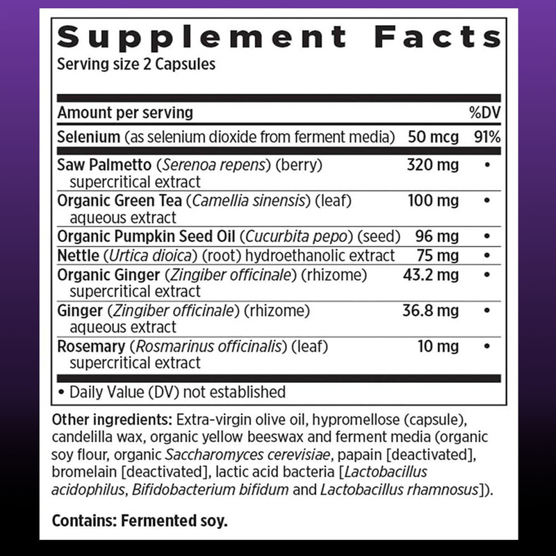 Selenium, Saw Palmetto, biologische groene thee, biologische pompoenzaadolie, brandnetel, biologische gember, gember, rozemarijn