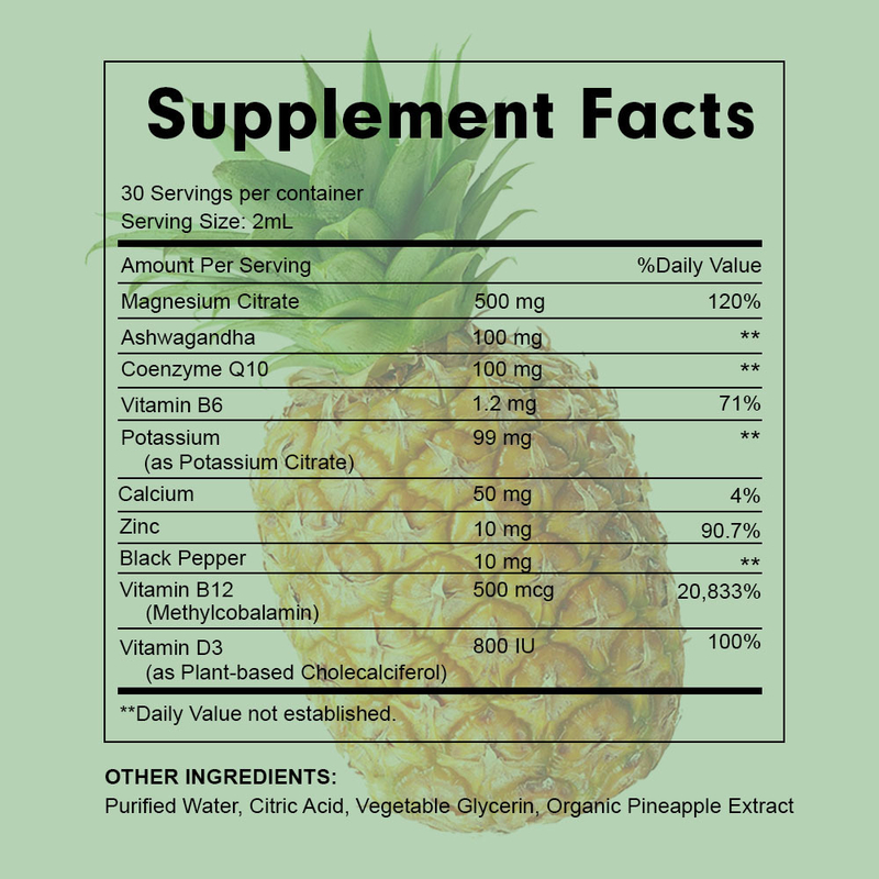 Magnesiumcitraat, ashwagandha, co-enzym Q10, vitamine B6, kalium, calcium, zink, zwarte peper, vitamine B12, vitamine D3
